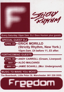 During 1994 and 1995 at ‘Freedom’ we booked a number of great guest DJs. I was lucky enough to play alongside Nick Warren (05/02/94), Pete Heller (12/11/1994), and Matthew Roberts (20/05/95). Erick Morillo’s gig was immense though; it was just as Reel II Reel were at the height and that pumping Strictly Rhythm sound that Morillo played hadn’t really been heard much. It was his first gig in Manchester. A few years ago, some ten years after the ‘Freedom’ gig, I met him in Glasgow and asked if he’d come and play another gig with me for the same fee as the first one; £200. He laughed.